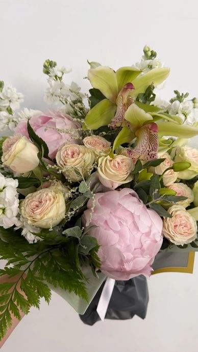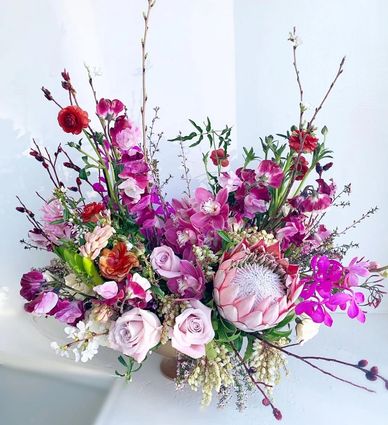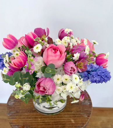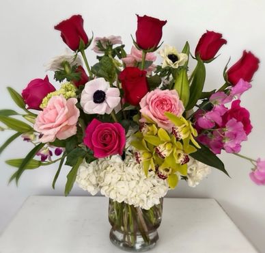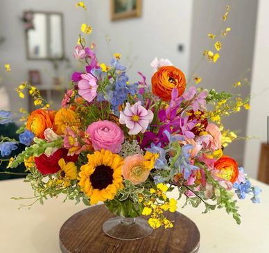 A $125 fresh flower arrangement is filled with high end florals, and takes our designs to a larger scale.